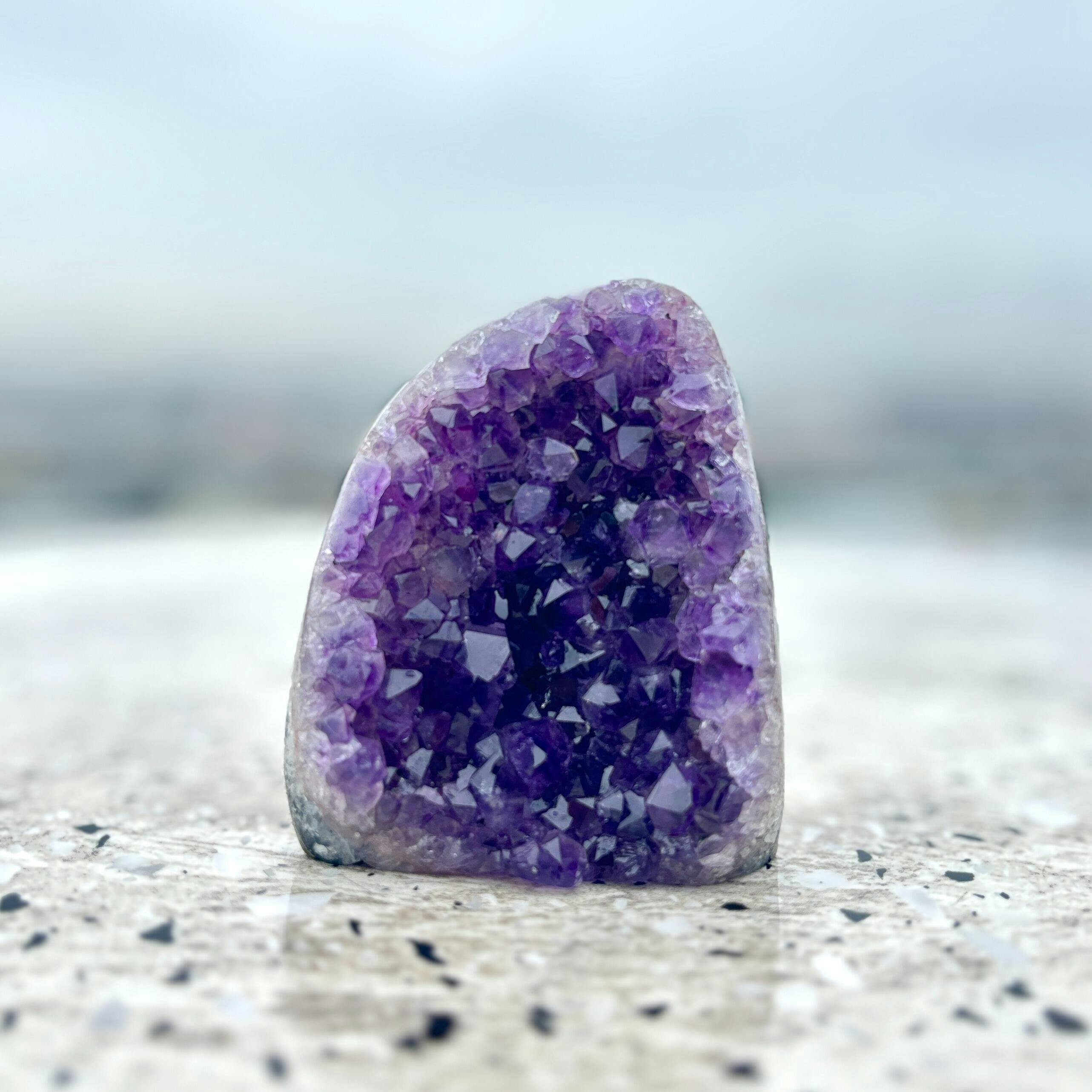 Formed in ancient volcanic caves, this Uruguay Amethyst Geode radiates calming, high-vibrational energy that transforms any space into a sanctuary of peace and clarity. Its deep violet clusters promote mindfulness, emotional balance, and spiritual connection.