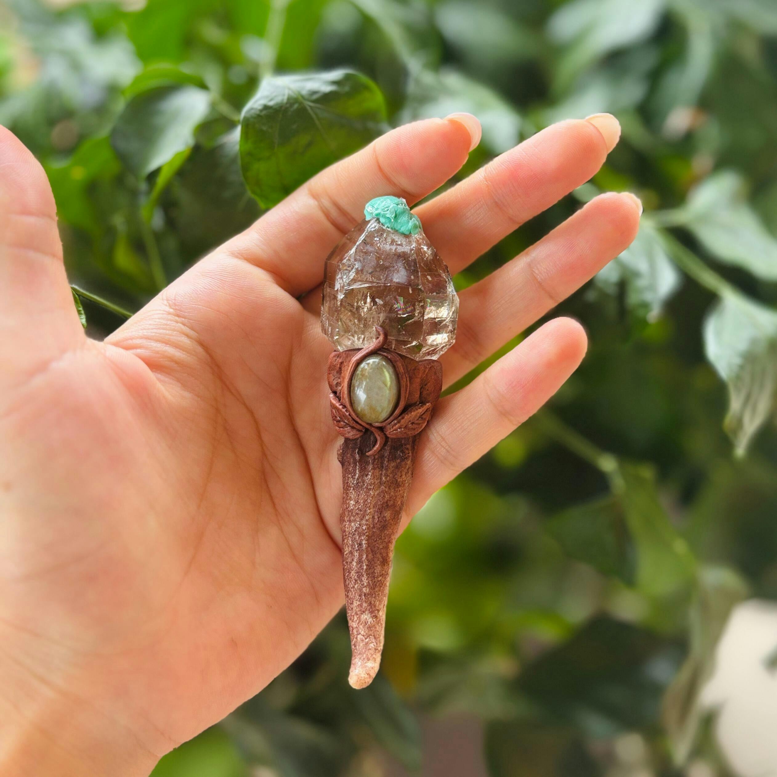 Each Antler Wand is a masterpiece of natural synergy—combining the grounding strength of deer antler with the celestial vibration of Herkimer and Elestial Quartz. Traditionally, shamans and healers used antler-based wands to channel earth energy while connecting to higher realms.